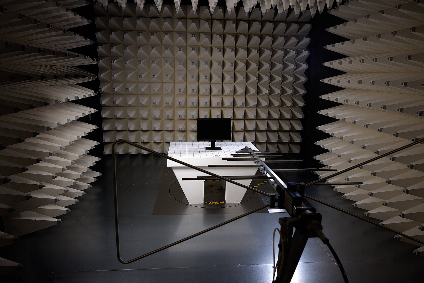 EIZO posiada własną komorę pomiarową EMC, w której można przetestować zgodność z międzynarodowymi i branżowymi przepisami dotyczącymi zakłóceń przychodzących i emisji promieniowania. Jest to kluczowa zdolność do rozwoju monitorów do wdrożenia w strefach bezpieczeństwa w celu wyświetlania poufnych lub poufnych informacji.
