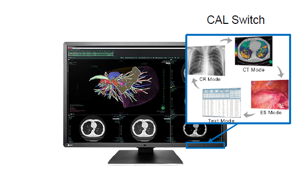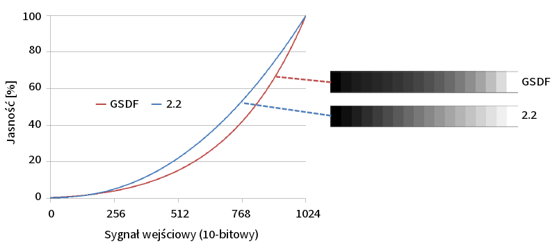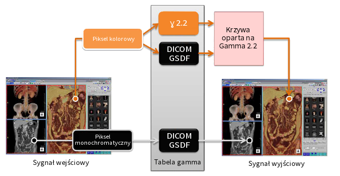 Niektóre monitory medyczne korzystają z technologii umożliwiających przełączanie się między obrazami DICOM w skali szarości i kolorowymi obrazami Gamma 2.2, aby wyświetlać jedne i drugie z odpowiednią krzywą gamma (rys. 2). Takie rozwiązanie wymaga zazwyczaj ręcznego przestawiania trybu i nie pozwala na wyświetlanie monochromatycznych i kolorowych obrazów jednocześnie na wspólnym ekranie.