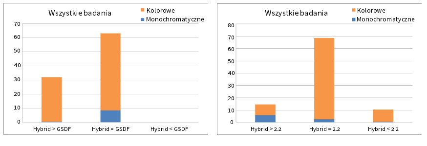 Podpunkt (2) wskazuje na dużą różnicę (37% spośród 86 kolorowych badań) w diagnozie pomiędzy trybem Hybrid Gamma PXL z „mieszaną” krzywą Gamma 2.2 a trybem z krzywą gamma GSDF. Wyniki sugerują, że analiza kolorowych obrazów jest bardziej efektywna w trybie Hybrid Gamma PXL niż w samym trybie GSDF.