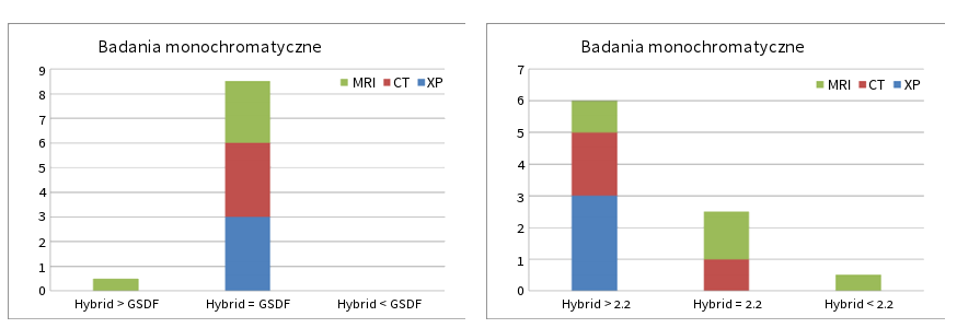 Rys. 8 pokazuje, że dla 8,5 z 9 monochromatycznych obrazów (ok. 94%) tryb Hybrid Gamma PXL stosujący DICOM GSDF został oceniony na równi z trybem DICOM GSDF, a w jednym przypadku tryb Hybrid Gamma PXL stosujący DICOM GSDF oceniono lepiej niż tryb DICOM GSDF. Nie zdarzyło się natomiast, by tryb DICOM GSDF został oceniony lepiej niż tryb Hybrid Gamma PXL.