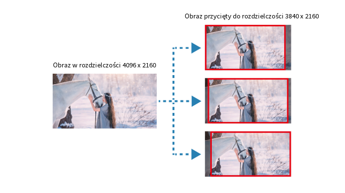 CG2700X oferuje funkcję DCI-4K Cropping, która wyświetla sygnał DCI 4K (4096 x 2160), przycinając obraz do natywnej rozdzielczości panelu 4K UHD (3840 x 2160). Użytkownik może zdecydować, czy obraz ma zostać wyśrodkowany, przycięty z prawej czy przycięty z lewej.