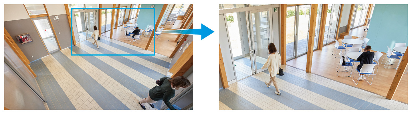 Funkcja Virtual PTZ pozwala operatorom cyfrowo powiększyć wybrany fragment wyświetlanego obrazu, aby przyjrzeć się szczegółom. Po powiększeniu można przesuwać obraz w górę, w dół, w lewo lub w prawo w czasie rzeczywistym. Jest to szczególnie przydatne przy pracy z kamerami, które nie mają fizycznych funkcji PTZ.
