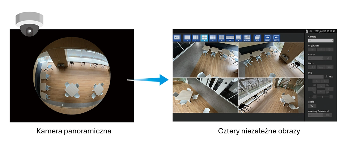 DX0131-IP obsługuje protokoły i-PRO i AXIS, co umożliwia korzystanie z funkcji specyficznych dla danego producenta. Na przykład, podczas strumieniowania z omnidirectional kamery i-PRO w trybie Quad Stream, można jednocześnie wyświetlić cztery niezależne widoki, zapewniając kompleksowy podgląd monitorowanego obszaru.