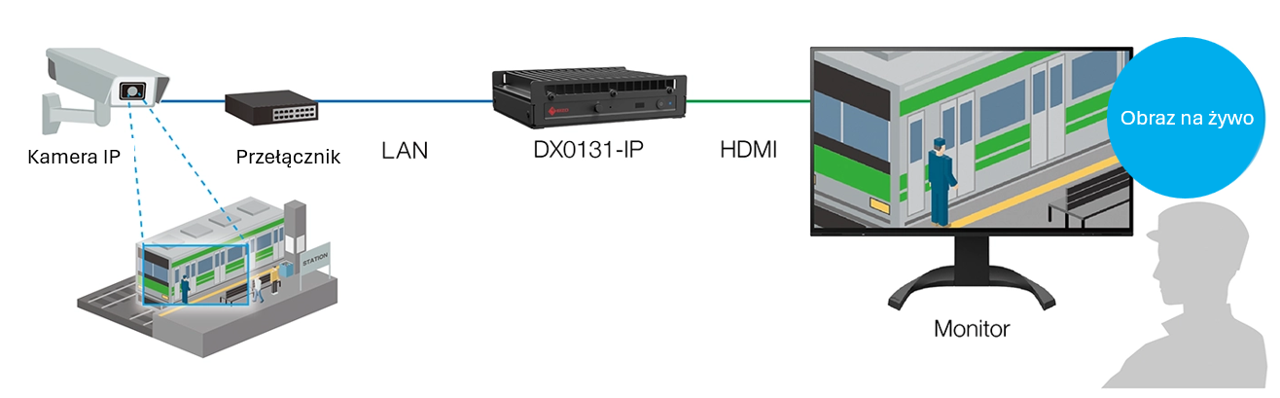 DuraVision DX0131-IP łączy się bezpośrednio z kamerą IP za pośrednictwem przełącznika sieciowego, umożliwiając przesyłanie obrazu do monitora przez kabel HDMI, bez konieczności użycia komputera. Upraszcza to instalację, skraca czas konfiguracji i obniża koszty pracy, a także ogranicza liczbę potencjalnych punktów awarii. Urządzenie obsługuje dekodowanie kodeków wideo H.265 lub H.264, zapewniając optymalną równowagę między jakością obrazu a efektywnością transmisji.