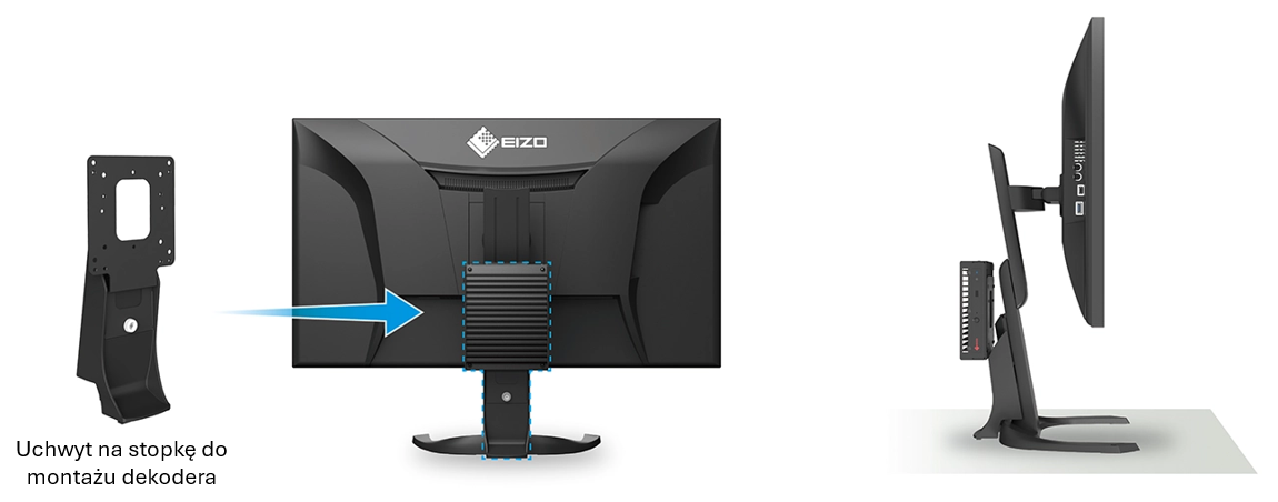 Dekoder można bezpośrednio zamocować do wielu monitorów EIZO przy użyciu uchwytu montażowego do stojaka monitora. Takie rozwiązanie pozwala na utrzymanie porządku na biurku, jednocześnie zachowując stabilność monitora i bezpieczeństwo podczas pracy.