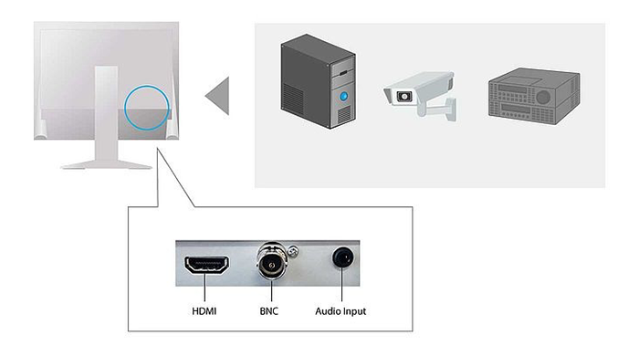 Monitor wyposażono w wejście HDMI, które umożliwia podpięcie monitora do PC w celu odbierania sygnałów ze źródła cyfrowego, takiego jak np. nagrywarka HDD. Dostępne jest także wejście composite (BNC), pozwalające na podpięcie monitora do systemu CCTV czy kamer monitoringu. Monitor obsługuje sygnały NTSC, PAL i SECAM.