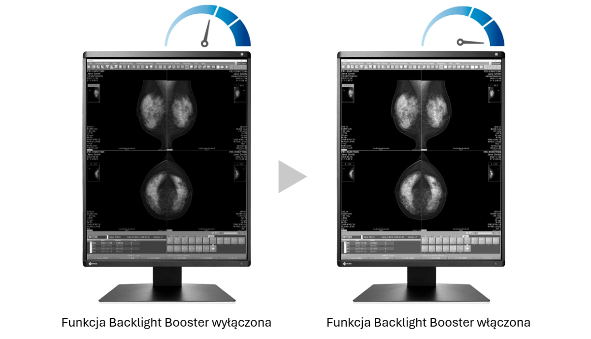 unkcja Instant Backlight Booster pozwala jednym przyciskiem tymczasowo zwiększyć jasność monitora do maksymalnego poziomu. Umożliwia to efektywniejsze przeglądanie obrazów medycznych, które wymagają wyższej jasności, aby łatwiej rozróżnić szczegóły.