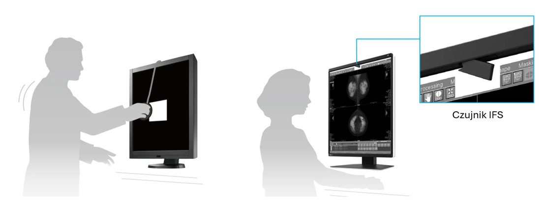 Dzięki wbudowanemu w przednią ramkę czujnikowi IFS (Integrated Front Sensor) oraz oprogramowaniu do kontroli obrazu RadiCS LE, użytkownik może z łatwością skalibrować monitor do standardu DICOM Part 14, bez potrzeby podłączania urządzenia zewnętrznego.