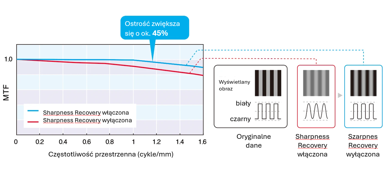 MTF (Modulation Transfer Function) określa numerycznie, jak wiernie panel przenosi szczegóły z oryginalnych danych obrazu na wyświetlany obraz. Po włączeniu funkcji Sharpness Recovery, w przypadku pary linii o szerokości 2 pikseli (częstotliwość przestrzenna 1,515 cykli/mm), wartość MTF wzrasta o około 45%.