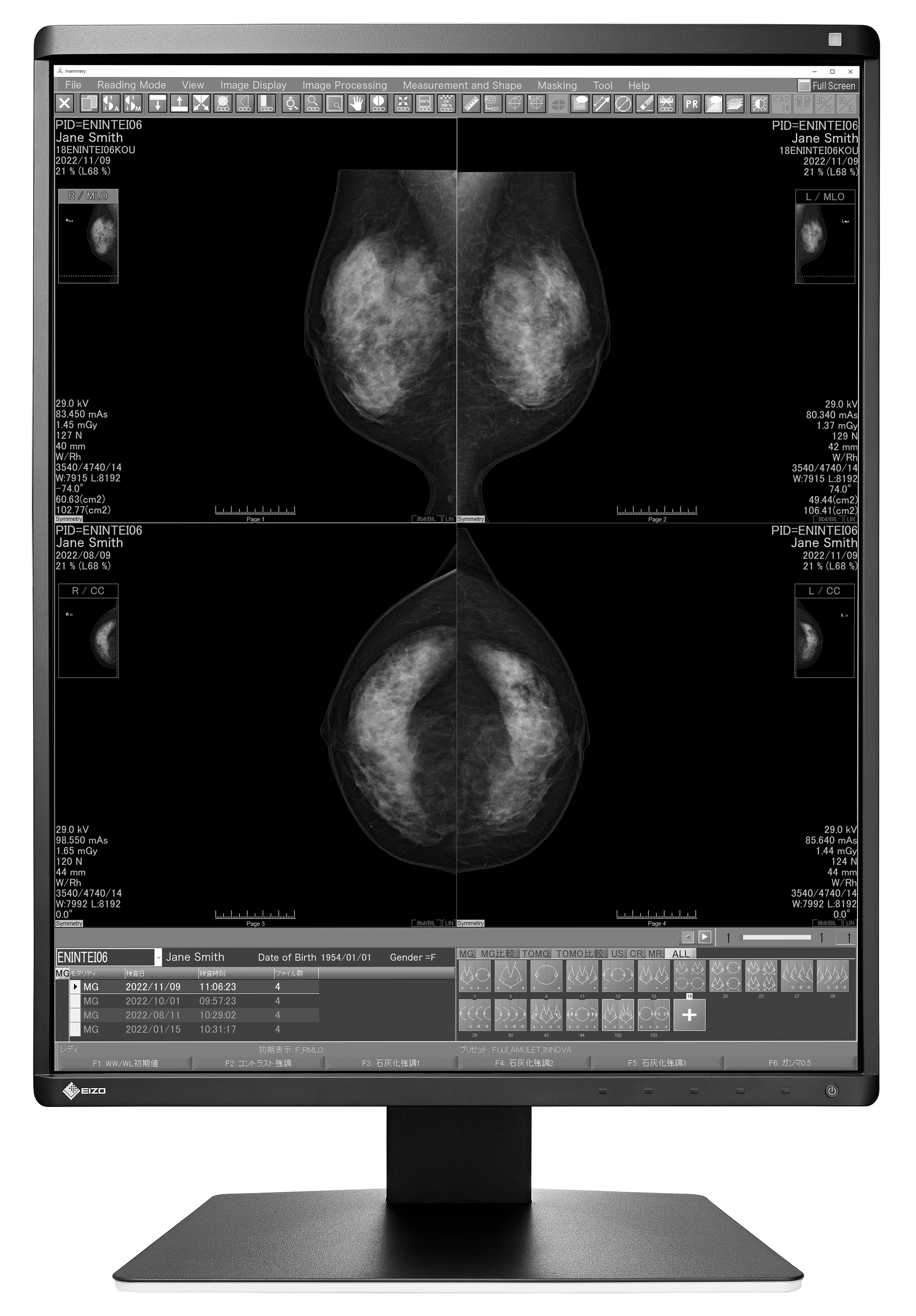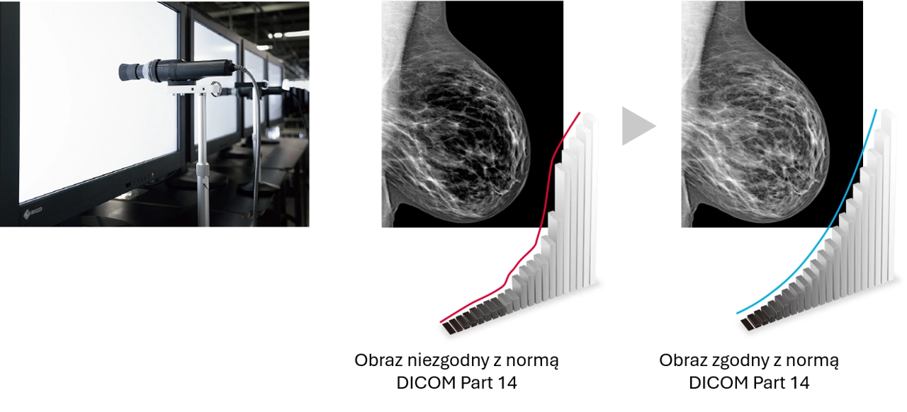 Łatwe w obsłudze oprogramowanie EIZO do kontroli jakości oraz czujnik kalibracyjny RadiCS UX2 (sprzedawany oddzielnie) umożliwiają precyzyjną kalibrację zgodną ze standardem DICOM Part 14 oraz zaawansowaną kontrolę jakości (QC). Rozwiązanie to spełnia wytyczne ACR Practice Guidelines oraz inne standardy kontroli jakości dla monitorów wykorzystywanych w cyfrowej mammografii.