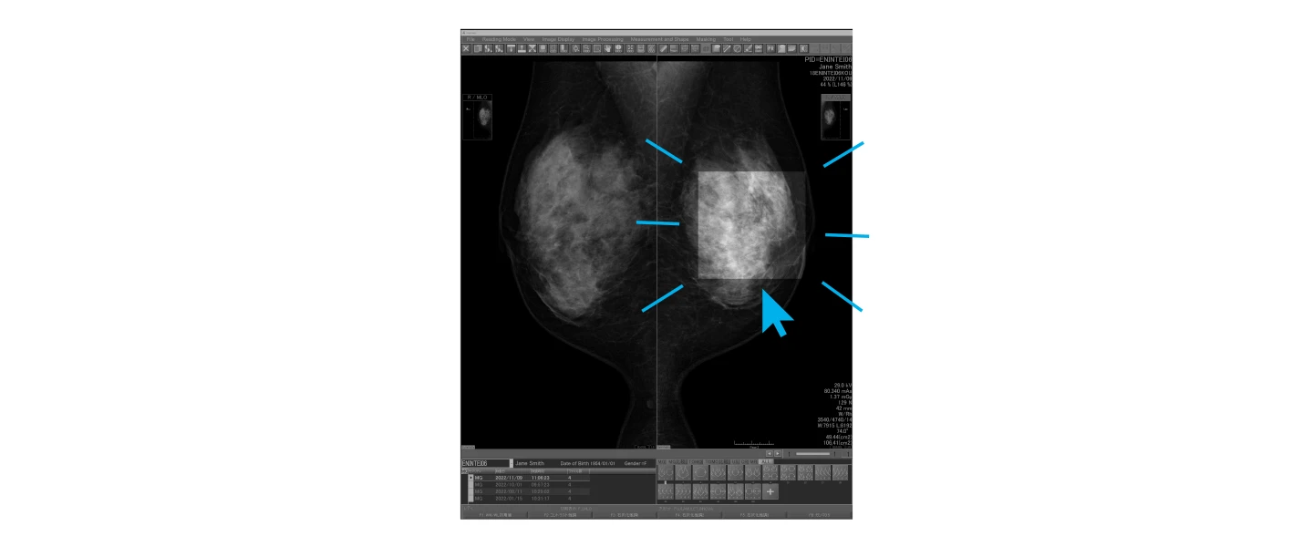Korzystając z funkcji Point-and-Focus, radiolog może zaznaczyć wybrane obszary obrazu za pomocą myszki i klawiatury, aby dokładnie je ze sobą porównać. Ocenę dodatkowo ułatwia możliwość zmiany jasności i skali szarości dla konkretnych punktów na ekranie.
