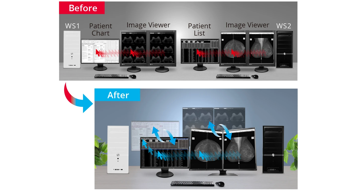 Nowoczesne workflow w obrazowaniu medycznym często wymaga wielu stacji roboczych i monitorów, co może być skomplikowane i wpływać na produktywność. Aby ułatwić pracę bez barier, monitor wyposażono w funkcję Switch-and-Go, która pozwala obsługiwać dwie stacje robocze za pomocą jednej klawiatury i myszy. Umożliwia to płynne przesuwanie kursora między ekranami, zmniejsza potrzebę korzystania z wielu urządzeń peryferyjnych i zwiększa efektywność całego workflow.