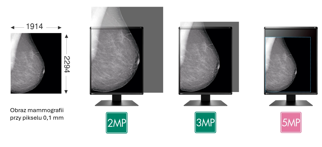 Gdy monitor wyświetla dane przekraczające jego maksymalną rozdzielczość, obraz jest próbkowany w dół (downsampling), co powoduje utratę jakości. GX570 wyświetla 5 megapikseli (2048 × 2560 pikseli) przy kroku pikseli 0,165 mm, dzięki czemu obrazy mammograficzne są wyraźniejsze i bardziej szczegółowe w porównaniu z monitorami 2- lub 3-megapikselowymi.